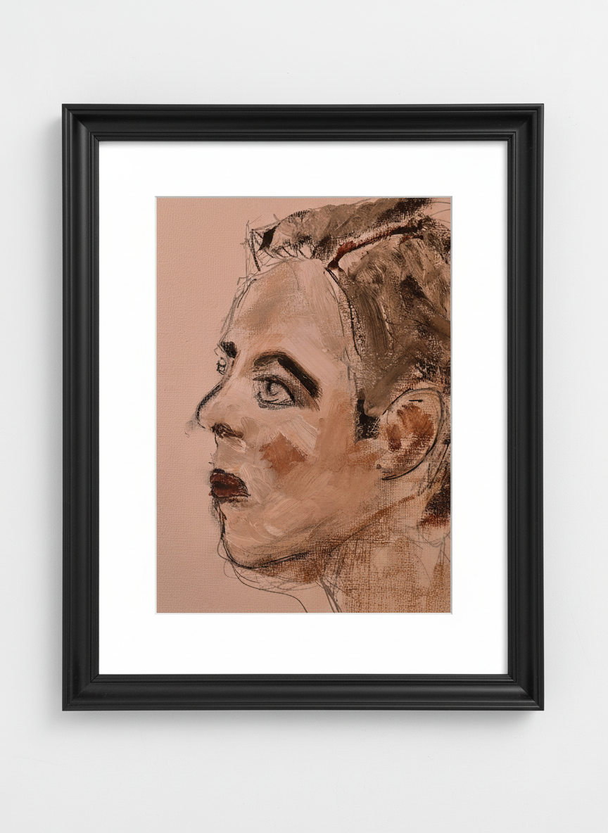 Original artwork: figure looking left. oil and charcoal on paper. 9" x 12". Available in black frame, ash frame, or unframed. From £249.00. Free UK shipping.